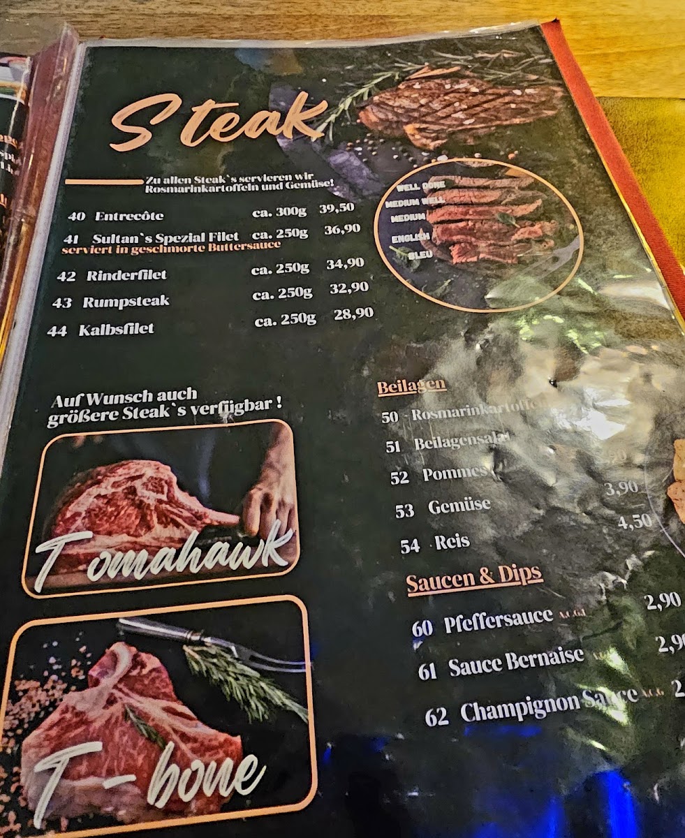 You’ll find options like freshly grilled meats including rumpsteak, rib eye, and tender rinderfilet, often accompanied by simple but complementary sides. The grill platter and dishes such as Beyti reflect classic Turkish flavors, designed for sharing or savoring as a full meal. On the lighter side, salads and small appetizers offer a nice balance to the richer plates.
