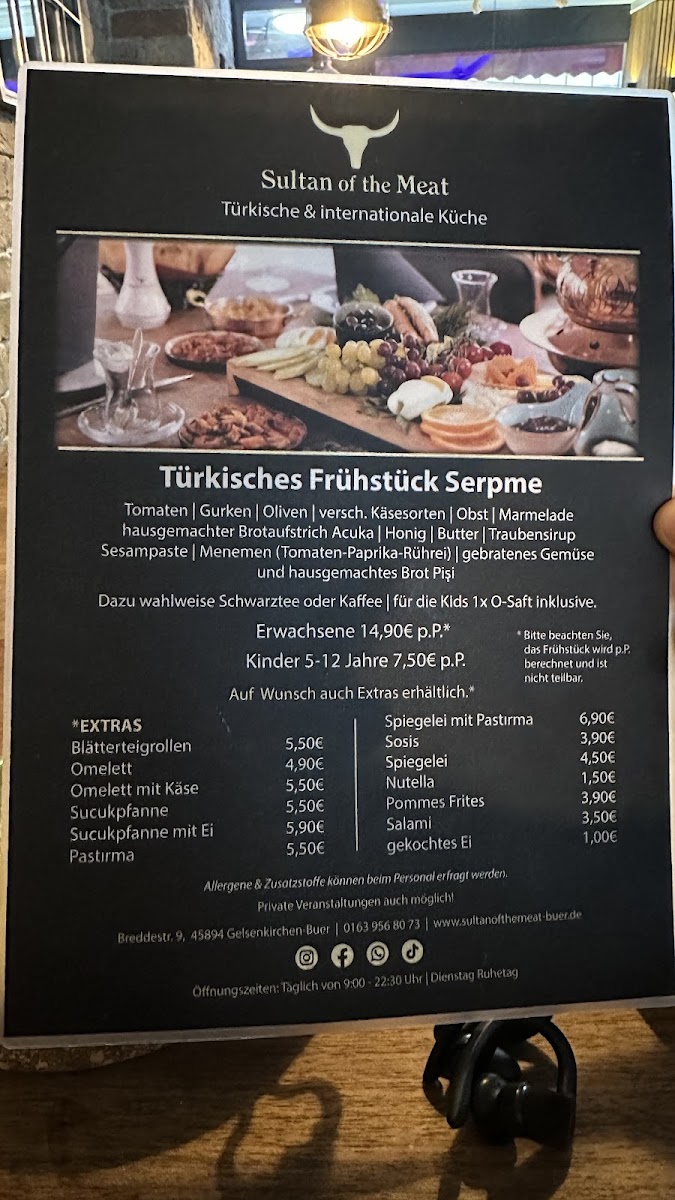The menu at Sultan of the Meat offers a balanced mix of hearty Turkish and grilled specialties that suit a relaxed, casual dining experience. It’s a place to enjoy well-prepared, satisfying dishes from morning to evening, whether you’re starting the day with a traditional Turkish breakfast or settling in for a slow-cooked, flavorful rib eye steak.
